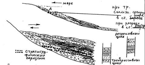 Если при погружении суши (трансгрессии моря) береговая линия сместится в сторону суши, то галечники продвинутся в сторону суши; пески будут отлагаться там, где раньше были галечники и перекроют их, на песках расположатся глины, затем - карбонатные илы. Т.е. участки накопления при трансгрессии будут смещаться в сторону суши. Каждый вид осадков будет "тянуться" в сторону берега.