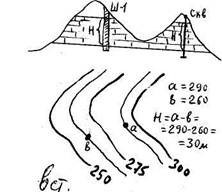 2. На геологической карте с горизонталями рельефа нахождением разности между отметками кровли и подошвы слоя.