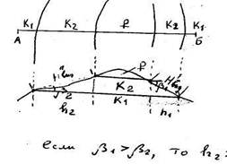 4. По данным видимой мощности и углу падения рельефа по формуле Нист=Нвид*sinβ Чем положе рельеф (угол его падения - β) и чем мощнее (Нист) пласт, тем больше ширина выхода на карте и видимая мощность Нвид.