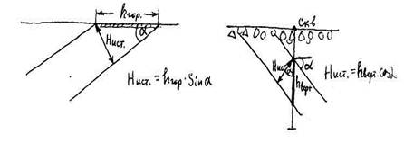 | 3. Пласт и местность наклонены в разные стороны: Нист=hвид sin(α+β) |
