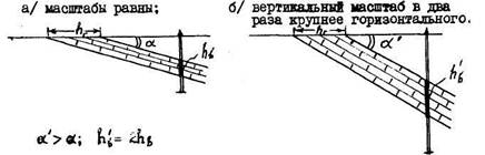 Иногда, когда нужно показать тонкие слои, приходится увеличивать вертикальный масштаб. При этом искажается рельеф, завышаются углы падения и мощности.