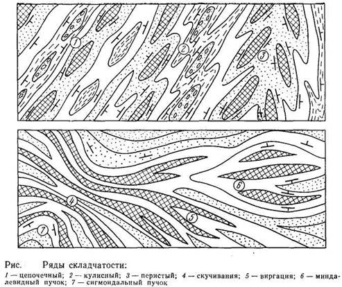 Ветвление складок в плане называется виргацией (5). Разветвление, сменяющееся новым схождением в плане складок в один ряд, называется миндалевидным пучком складок (6). Серия параллельных дугообразных в плане складок - сигмоидальный пучок (7). Встречаются также радиальные пучки складок с лучистым расположением и разветвлением складок вокруг какого-либо центра поднятия или опускания.