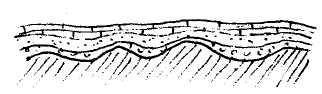 рельефа (повышение и понижение слоевых границ, изменение мощности - они меньше под выступами рельефа). Вверх по разрезу различие мощностей выравнивается.