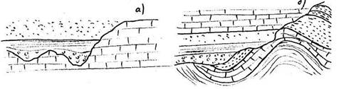 Прилегание. При резких очертаниях древнего рельефа осадочные породы заполняют вначале пониженные участки рельефа. У крутых склонов будет наблюдаться параллельное (а), либо несогласное (б) прилегание.