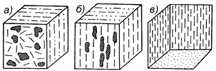 | Рис.. Текстуры метаморфических пород. а – плоскопараллельная; б – линейно-плоскостная; в – линейно-параллельная, или линейная. |