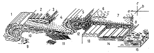 | Рис.. Соотношение внутренних структурных элементов с крупными лежачими складками (Wilson,1961). 1 – фестончатые и паразитические складки, муллион-структуры, параллельные оси b; 2 – кварцевые стержни, параллельные оси b; 3 – гальки, растянутые, параллельные оси b; 4 – линейность и микроскладки, параллельные оси b; 5 – моноклинные (асимметричные) складки; 6 – линейность, параллельная оси a; 7 – дислокационный кливаж; 8 – шарьяж; 9 – микроскладки; 10 – кливаж осевой плоскости; 11 – кливаж за счёт осложнения микросбросами микроскладок; 12 – кливаж разлома; 13 – складки волочения; 14 – будины, параллельные оси b; 15 – гальки и другие включения, растянутые параллельные оси a. |