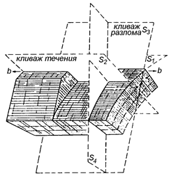 Кливаж течения (S2) обычно ориентирован под большим углом к слоистости (S1) и приводит к образованию плойчатости на поверхности слоистости, параллельной оси складки b. Кливаж разлома (S3) также пересекается со слоистостью по b, но он выражен менее отчётливо.