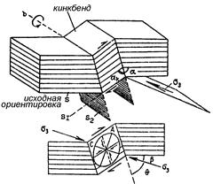 | Рис.. Структура кинкбенд и соотношение её с положением осей эллипсоида деформаций и главных напряжений. |