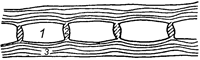 | Рис.. Будинированный пласт в поперечном сечении. 1 – будина; 2 –межбудинное пространство, заполненное жильным материалом; 3 – вмещающие пластические породы. | |||
