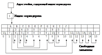 2. Для хранения вершин БД используется СД типа «массив». Массив может располагаться в статической или динамической памяти. Элементы массива представляют собой СД типа «запись», содержащую информационную часть и адреса сыновей вершины БД. Индекс элемента массива, содержащего корень дерева, находится в специальной ячейке динамической памяти, адрес которой хранится в статической памяти. Элементы массива, не являющиеся вершинами БД, объединяются в список свободных элементов (ССЭ), на первый элемент которого указывает правый сын первого элемента массива. При включении элемента в БД берется первый элемент ССЭ, а исключаемый элемент заносится в начало ССЭ. БД (рис.21) может быть представлено в памяти так, как показано на рис.23. При таком способе в одном массиве может быть размещено несколько БД.