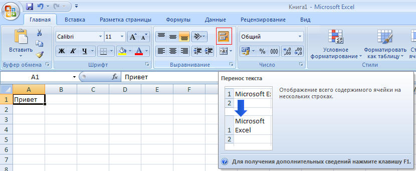 Расположить текст несколькими строками в одной ячейке можно двумя способами: