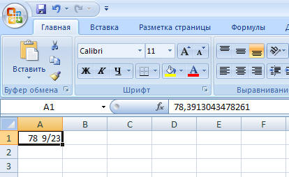 Можно вводить числа с простыми дробями. При вводе с клавиатуры простую дробь от целой части числа отделяют пробелом. В строке формул простая дробь отображается как десятичная.