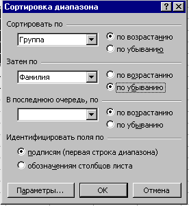 Пункт «Сортировка» позволяет осуществить сортировку по выбранному критерию по одному или, в порядке приоритета, по двум или даже трем полям списка.