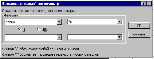 «Фильтр» дает возможность показывать только те записи в списке, которые удовлетворяют некоторому критерию. Так установка пользовательского автофильтра, показанная на рис.3, отобразит в списке только фамилии оканчивающиеся на буку «в».