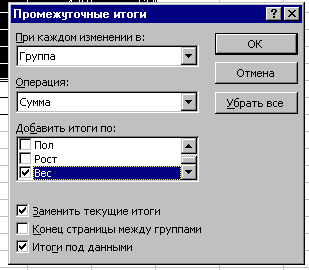 Пункт «Форма» дает возможность быстрого ввода данных в список. Пункт «Итоги» позволяет подвести суммирующие итоги под данными каждой группы в списке. На рис.4 показано диалоговое окно подведения итогов, а на рис.5 результат выполнения этой операции.