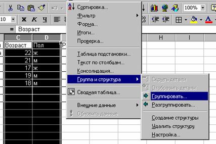 Пункт «Группа и структура» применим не только к спискам Excel и позволяет изменять уровни детализации представления информации на листе Excel. Чтобы создать простейшую структуру на листе можно выделить несколько столбцов или строк и нажать пункт «Группировать».