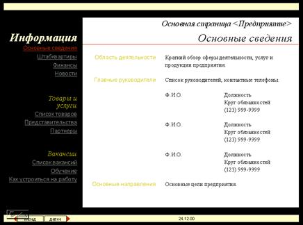 Шаблоны РР делятся на две категории - стандартные и интерактивные. Интерактивные шаблоны были специально спроектированы для работы в среде Web, использующей язык гипертекстовой разметки (HTML). В них вкючены гиперссылки, клавиши перемещения и иные средства, часто встречающиеся на основных страницах и в других документах Web. Например, на базе шаблона Основная страница компании (интерактивная) /см. рисунок/ можно создать удобную многоэкранную презентацию, которую легко приспособить к стандартам деловой Web-страницы.