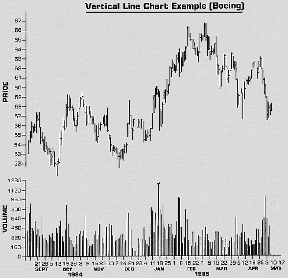 Метод Вайкоффа строится на трех основных типах графиков - Вертикальные Линии (Бары), Фигуры (крестики-нолики) и дополненный волновой график. Графики баров (Рисунок 1) делаются для отдельной акции, группы или сложного среднего по цена максимумов, минимумов, закрытий плюс их объем. По графикам баров инвесторы по методу Вайкоффа могут определять направление, в котором движутся цены, наиболее подходящее время для покупки, продажи или закрытия, а также по какой цене размещать свои стоп-ордера.