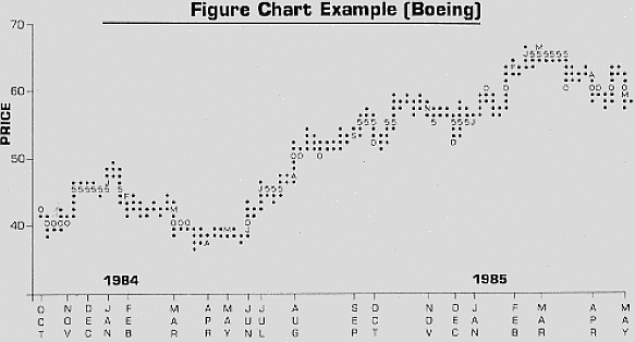 График фигур (крестики-нолики) (Рисунок 2) отслеживает изменения цен только от одного целого пункта до следующего, сосредотачиваясь на уровне цены и игнорируя время. По ним инвесторы Вайкоффа предсказывают приблизительное число пунктов, на которые должна продвинуться акция, группа акций или индекс.