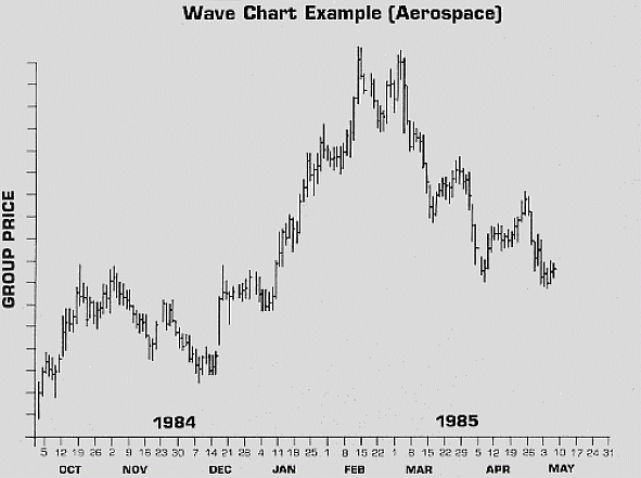 Его волновой график (Рисунок 3) записывает совокупные цены по крайней мере пяти ведущих акций, во многом подобно сегодняшним графикам индексов акций. Выбор этих акций - не постоянен. Группа отрегулирована так, чтобы включать в себя акции, постоянно активные в индустрии, показывающие реальное лидерство. Волновой график дает инвестору средство обнаружения критических точек в движении рынка от одной волны к другой, часто предупреждая о подходе дня разворота до того, как он станет очевидным по средним.