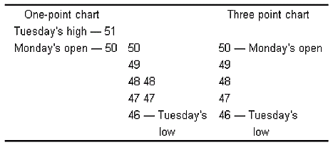 Трехпунктовый график сжимает однопунктовый, отбрасывая все изменения, величиной менее трех пунктов. В нашем предыдущем примере, единственное трехпунктовое движение происходит между максимумом и минимумом вторника.