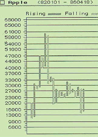 Рисунок 15. Трехпунктовый график с боксом в $1.00 box и разворотом в $3.00 для Apple Computer, Inc. недельные цены. Помните, что здесь нет шкалы времени.