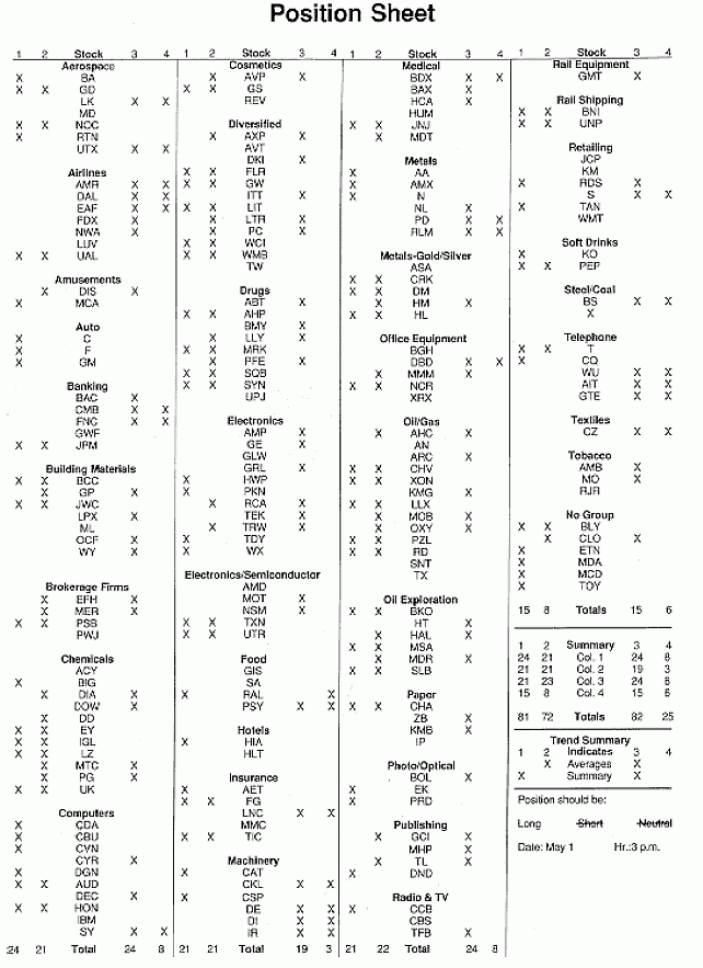 Построение Листа Позиции начинается со списка отдельных акций - минимум 50, но предпочтительно 100 или более - разбитых по группам. Слева от названий акций - две колонки, одна для Позиции 1, другая для Позиции 2. Справа от названий акций - еще две колонки для Позиций 3 и 4. В нижнем правом углу оставлено место для числа акций в каждой позиции, положения всего рынка и торговых позиций аналитика.
