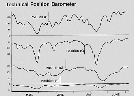 Построение Барометра Технической Позиции - ежедневное нанесение на график общего количества акций в каждой позиции. Каждая позиция - отдельная линия на графике и по барометру сразу видно, увеличивается число акций в каких-либо позициях или уменьшается. Это будет ключом к растущей силе или слабости технической позиции рынка.