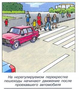 Водители, заметив на нерегулируемом пешеходном переходе людей, должны снизить скорость или остановиться, но это выполняется ими не всегда, поэтому пешеход должен начинать переход только после того, как убедится в безопасности движения.