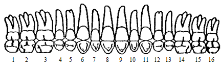 | Условные обозначения: Х - зуб отсутствует С - кариес Р - пульпит Рт - периодонтит А - амфодонтоз (подвижнос-ть I, II, III) *Пл - пластмасса *Пц - цемент К - коронка И - искусственный зуб Кж, Иж -желтый металл Дк - дефект (скол) коронки З - полное заращение зубной лунки (больше 6 мес.) H- А, В, С, D, Е - степень стирания зубов по H.Haishi, 1966г. |