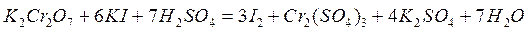 Например, K2Cr2O7определяют путем добавления к его раствору KI и H2SO4. Выделившийся в результате реакции I2 (заместитель)титруют раствором титранта Na2S2O3. При этом протекают следующие реакции: