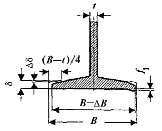 В - первісна ширина полиці; DВ - знос полиці; t - товщина стінки; f1 - відгин полиці; d - початкова товщина полиці на відстані (B-t)/4 від краю; Dd - зменшення товщини полиці внаслідок зносу