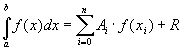 . Часто получить выражение для первообразной не удается. Подинтегральная функция может быть задана в табличном виде. В этих случаях подинтегральную функцию заменяют на некоторую аппроксимирующую функцию, интеграл от которой легко вычисляется в элементарных функциях. Для аппроксимации подинтегральной функции часто используют интерполяцию. Во многих случаях формулы для приближенного вычисления интегралов (57) можно записать в виде
