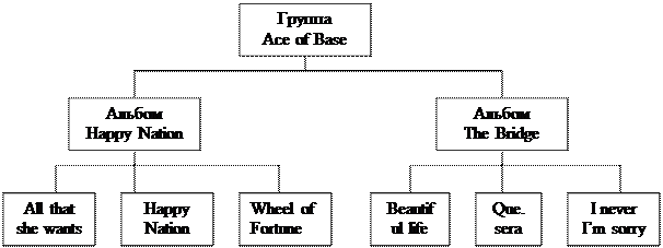 В атрибутах, описывающих песню, нет названия альбома, но по линиям связи можно сказать, какая песня принадлежит альбому. По линиям связи можно также определить принадлежность альбома группе. Из данной иерархической структуры можно узнать: