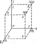 Шесть невесомых стержней соединены своими концами шарнирно друг с другом в двух узлах и прикреплены другими концами (тоже шарнирно) к неподвижным опорам А, В, С, D (рис. С4.0 – С4.9, табл. С4). Стержни и узлы (узлы расположены в вершинах H, К, L или М прямоугольного параллелепипеда) на рисунках не показаны и должны быть изображены решающим задачу по данным таблицы. В узле, который в каждом столбце таблицы указан первым, приложена сила P =200 Н; во втором узле приложена сила Q =100 Н. Сила Р образует с положительными направлениями координатных осей х, у, z углы, равные соответственно α1 = 45°, β1 =60°, γ1 = 60°, а сила Q – углы α2 =60°, β2 =45°, γ2 =60°; направления осей х, у, z для всех рисунков показаны на рис. С4.0.