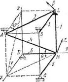 На рис. С4.10 в качестве примера показано, как должен выглядеть чертеж С4.3, если но условиям задачи узлы находятся в точках L и М,а стержнями являются LM, LA, LB; MA, MC, MD. Там же показаны углы φ и Θ.