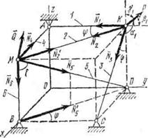Дано: P =100 Н, α1 =60°, β1 =60°, γ1 =45°; Q =50 H, α2 =45°, β2 =60°, γ2 =60°; ψ =30°, φ = 60°, δ =74°. Определить: усилия в стержнях 1 – 6.