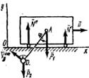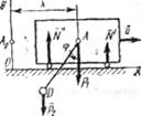 Решение. Рассмотрим механическую систему, состоящую из тележки н груза D, в произвольном положении. Изобразим действующие на систему внешние силы: силы тяжести Рь Рг и реакции плоскости N', N". Проведем координатные оси Оху так, чтобы ось у проходила через точку А0, где находился центр масс тележки в момент времени t0= 0.