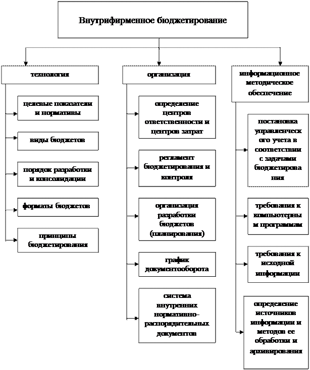 2. Организацию бюджетирования, предполагающую формирование центров финансовой собственности и центров затрат; создание регламента разработки бюджета; организацию его исполнения и механизма контроля; определение временного интервала бюджета; распределение функций и ответственности между уровнями управления по разработке и исполнению бюджета; график документооборота; система внутренних нормативных и распорядительных документов (положений и т.д.).