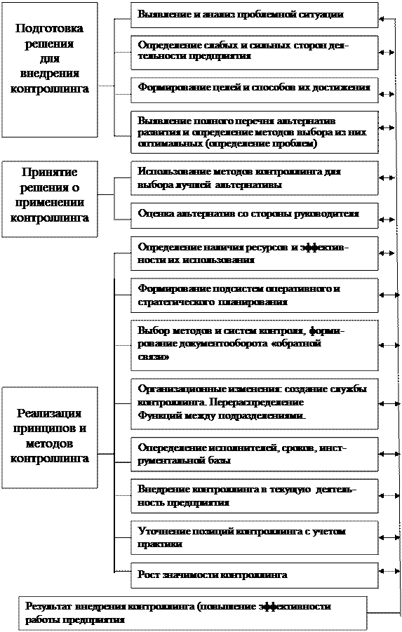 Контроллинг как эффективная система решения наиболее сложных проблем в развитии предприятия предполагает проведение комплекса мер по его внедрению на предприятии. При этом целесообразно не только создать службу контроллинга на предприятии, но и поменять философию управления им: перейти к жестко регламентированной и подконтрольной системе принятия решений с оценкой деятельности подразделений и сотрудников по конечному результату. Изменяются и экономико-организационные отношения внутри предприятия: повышается ответственность и мотивация персонала за своевременное и качественное выполнение заданий и мероприятий плана в рамках определенной компетенции.