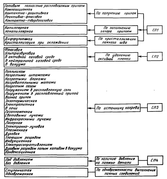 Согласно ГОСТ 17349-79, в настоящее время установлена следующая технологическая классификация способов пайки (рис. 5). Технологическая классификация способов пайки базируется в основном на альтернативности их признаков. В наименование способа пайки конкретного изделия должны войти по одному или несколько наименований способов из каждой группы и в том же порядке, в каком они перечислены на рис. 5. Например, «контактно-реактивная капиллярная диффузионная печная пайка в вакууме под давлением».