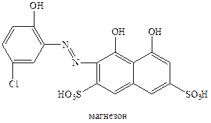 2. С магнезоном (п -нитробензолазорезорцином) с образованием осадка или раствора темно-синего цвета. Реакцию ведут в основной среде (рН >10). Реакция дробная. Мешающие ионы: катионы р- и d-элементов, NH