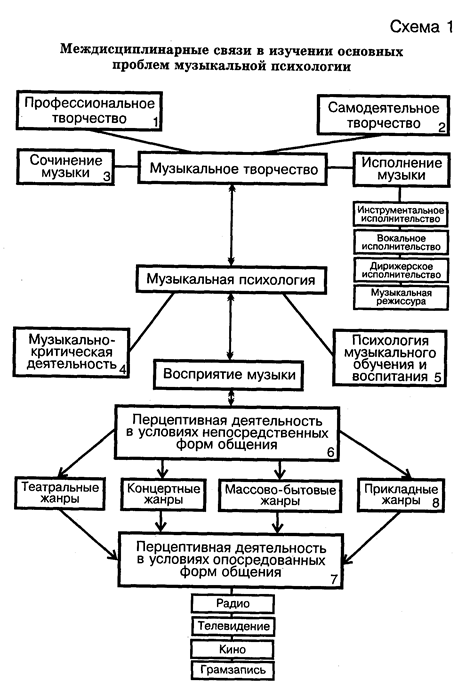 Схема 1. Междисциплинарные связи в изучении основных проблем музыкальной психологии: Культурология, праксиология, теория искусств, социология искусства, музыкальная палеография, семиотика, герменевтика, история музыки, психология' музыкального творчества, психология познания, физиология высшей нервной деятельности, эстетика, аксиология, майевтика. q Культурология, психология искусства, психология творчества, теория и история исполнительства, социология музыки, социальная психология, музыкальная педагогика, клубоведение, частные методики обучения пению и игре на инструментах, теория искусства. Q Общая психология, теория гармонии, полифонии. 4 Эстетика, теория искусств, герменевтика, майевтика, культурология, психология музыкально-критической деятельности, психология пропаганды, социология музыки, история искусств, аксиология, теория интерпретации музыки, этнопсихология, теория гармонии, полифонии. Сравнительная педагогика, история и теория культуры, педагогика, методики обучения музыке, социальная психология, социология образования, возрастная психология и физиология, психология управления, теория искусств, теория музыки, праксиология. д Культурология, психология музыкального восприятия, общая психология, возрастная и педагогическая психология, теория искусств, социология музыки, социология театра, социология кино, социальная психология, этнопсихология, акустика, герменевтика, майевтика, анализ музыкальных произведений, эстетика, кибернетика, теория информации. Культурология, искусствоведение, техническая эстетика, дифференциальная психология, теория искусств, психология труда, медицинская психология, психология быта, рекламы, театральная психология, эстетика, психотерапия, клубоведение. Q «Пространственная музыка», светомузыка, звуковая стенография, комитатная музыка, эстетизация звуковой среды, применение музыки в промышленности и медицине, обрядовая музыка.