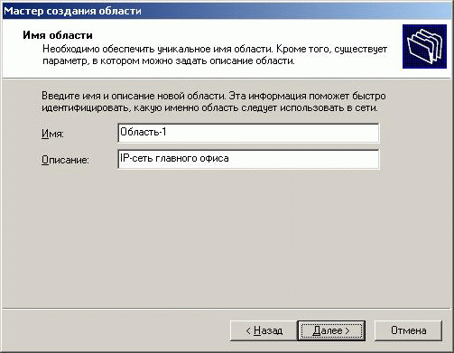 - Имя и описание области. В больших сетях именование областей и задание их краткого описания облегчает работу администратора за счет более наглядного отображения в консоли всех созданных областей (рис. 10.7).