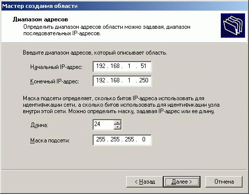 Создать область можно, щелкнув правой кнопкой мыши на имени сервера и выбрав пункт меню " Создать область " (или выбрав аналогичный пункт в меню " Действие " консоли DHCP). Консоль запустит " Мастер создания области ", который позволяет по шагам определить все необходимые параметры: