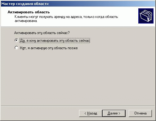 - Запрос на активацию области. IP-адреса, заданные в созданной области, не будут выдаваться клиентам, пока область не будет активирована (рис. 10.11):
