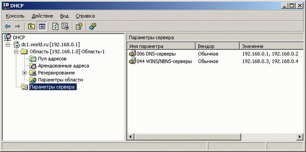 Если какие-либо параметры (например, адреса серверов DNS или WINS) являются общими для всех областей, управляемых данным DHCP-сервером, то такие параметры лучше определить не в разделе параметров каждой области, а в разделе параметров самого сервера (рис. 10.12).