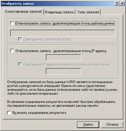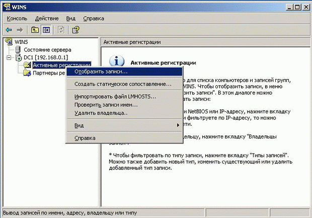 Для просмотра записей, хранящихся в БД WINS-сервера, необходимо открыть консоль управления WINS, раскрыть в консоли узел, относящийся к данному серверу, щелкнуть правой кнопкой мыши на разделе " Активные регистрации " и выбрать " Отобразить записи " (рис. 10.15):