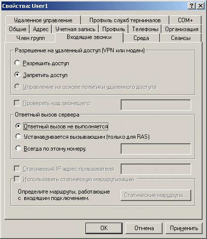 Если домен Active Directory работает в смешанном режиме, то разрешения на удаленный доступ определяются только в Свойствах пользователя на закладке " Входящие звонки " (Dial-In). При этом есть только два варианта — разрешить или запретить (рис. 10.22). по умолчанию для каждого нового пользователя задается запрещающее правило. Кроме разрешения/запрета можно также настроить Обратный вызов сервера (Call-back). Здесь имеются три варианта: