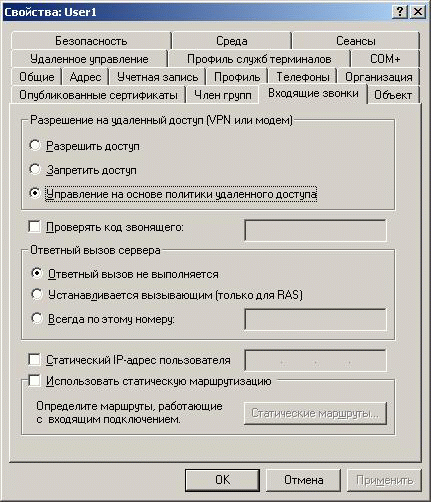 При отсутствии сервера RADIUS (см. ниже) разрешения на подключение пользователя к серверам удаленного доступа определяются комбинацией Свойств пользователя и Политик удаленного доступа, настраиваемых индивидуально для каждого сервера удаленного доступа.